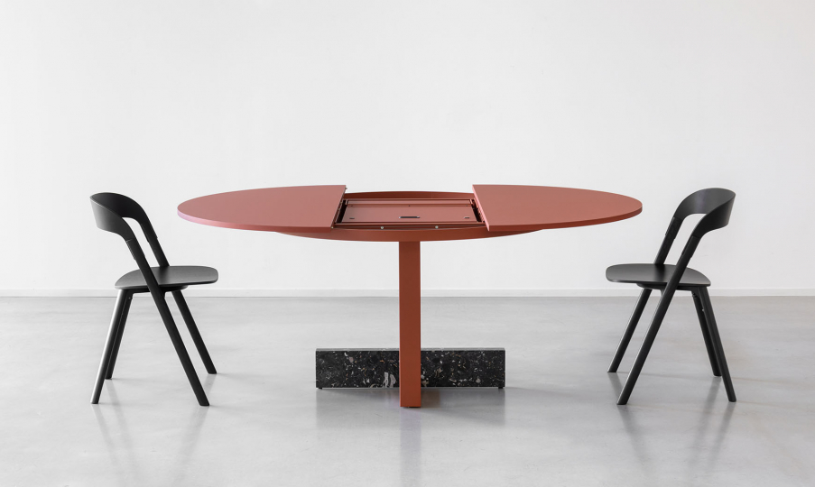 Dessinée par BrogliatoTraverso pour Magis, Pied-à-terre est une table ronde parfaite pour les petits appartements : avec un diamètre de 125 cm lorsqu’elle est fermée, elle attend 180 cm lorsqu’elle est ouverte.