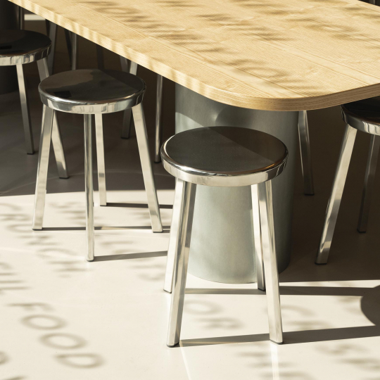 The interior design speaks to a contemporary, tech-savvy audience, seamlessly integrating digital screens and an intuitive menu system within a calming environment. Soft yellow tones create a warm, welcoming atmosphere, complemented by our Déjà-vu chairs and stools, which enhance the interior with their streamlined aesthetic.
