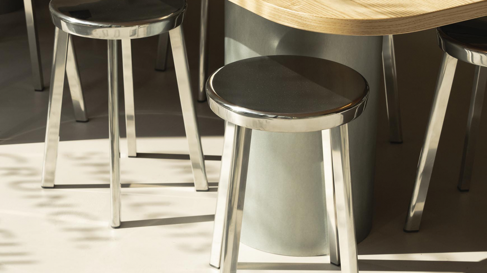 The interior design speaks to a contemporary, tech-savvy audience, seamlessly integrating digital screens and an intuitive menu system within a calming environment. Soft yellow tones create a warm, welcoming atmosphere, complemented by our Déjà-vu chairs and stools, which enhance the interior with their streamlined aesthetic.