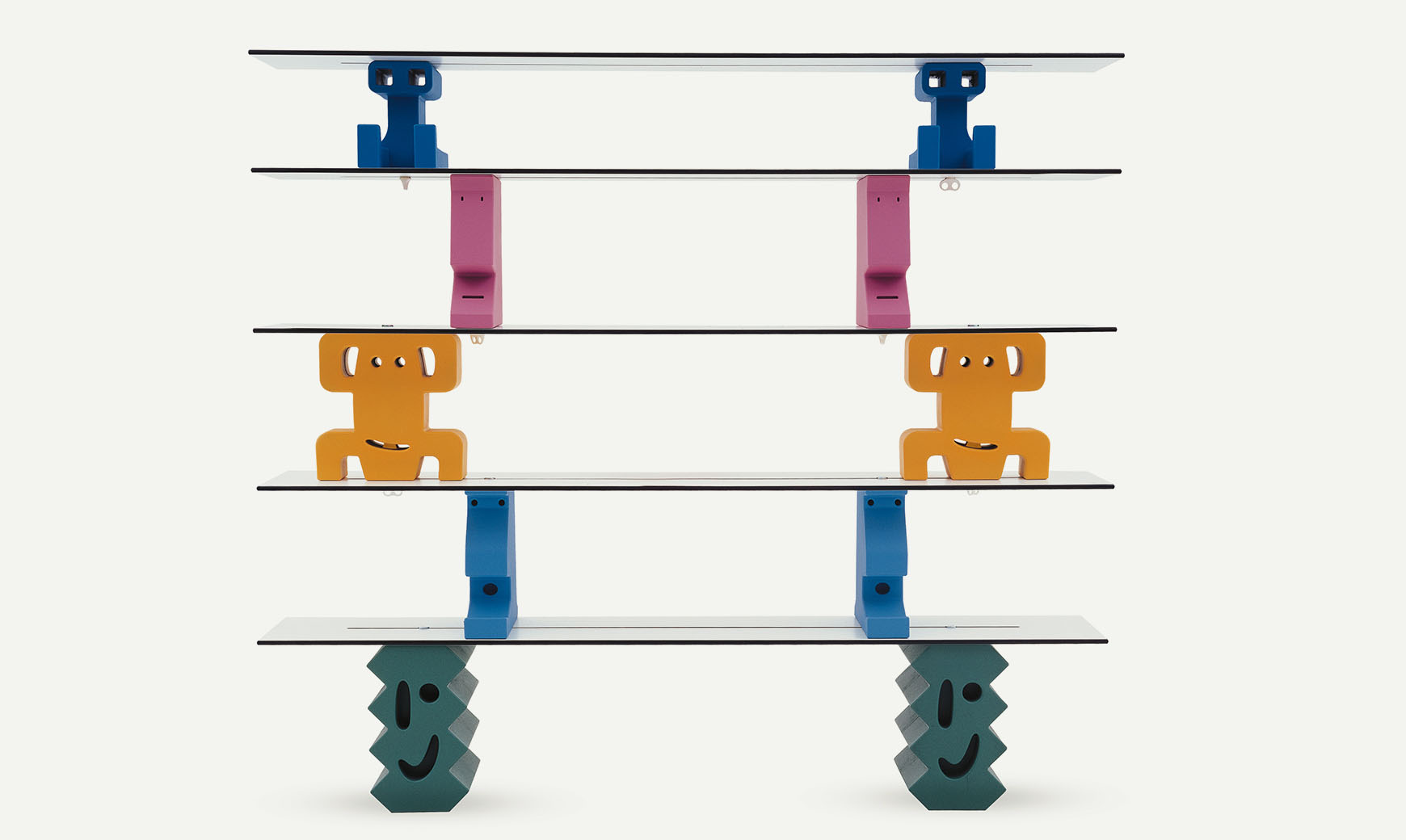 Material: ladrillos en polietileno. Estantes en laminado HPL blanco, borde negro.