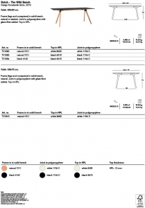 Matériaux: structure (pieds et traverse) en hêtre massif naturel; joints en polypropylène chargé avec fibre de verre; plateau en HPL.