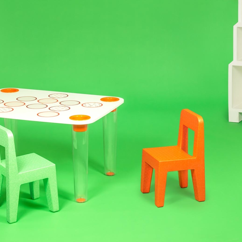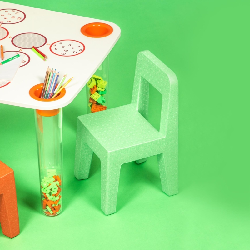 Matériaux: pieds en polycarbonate transparent cristal, moulé par injection standard. Plateaux décorés en MDF avec revêtement en polymère. Porte-plumes en ABS.
