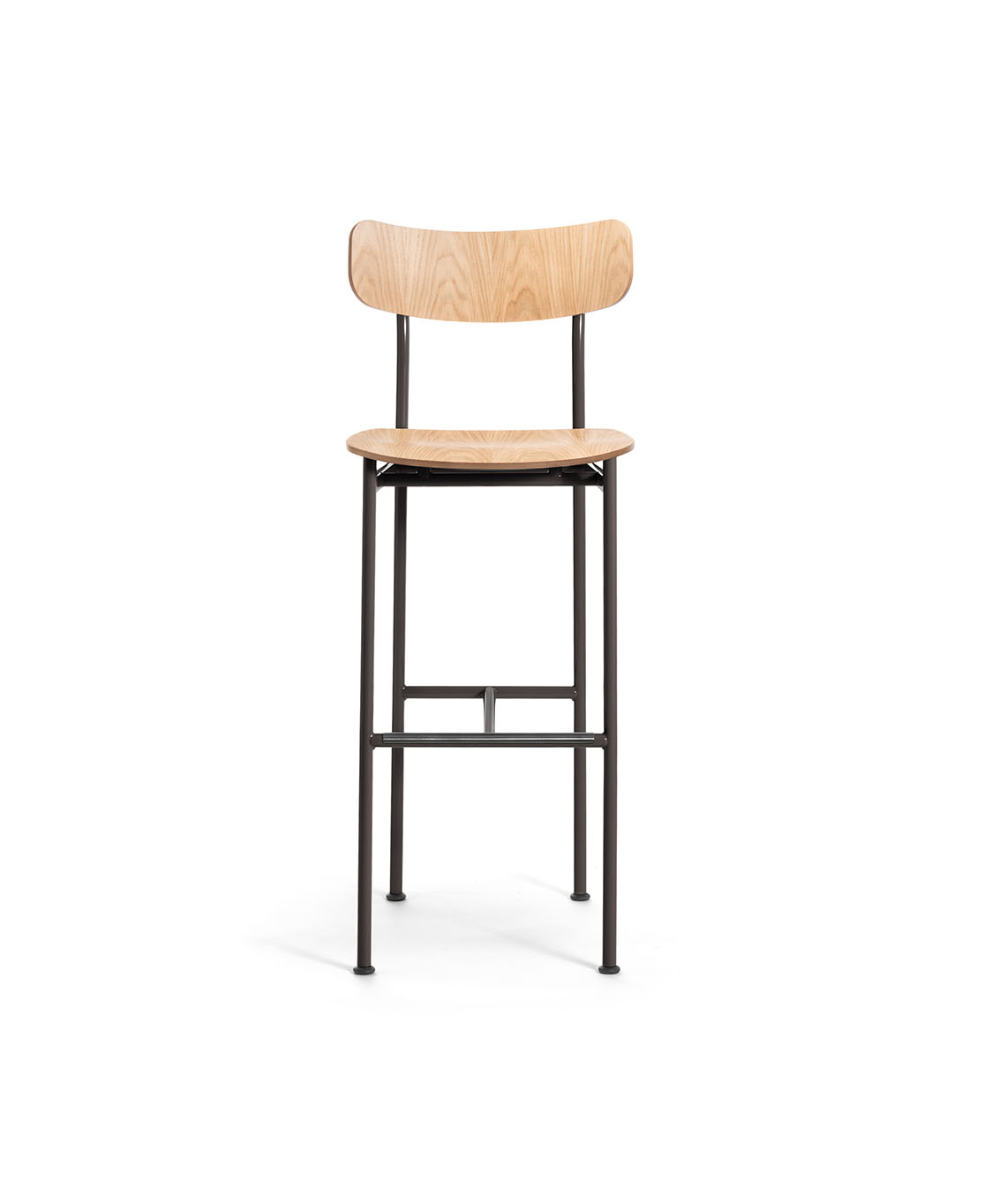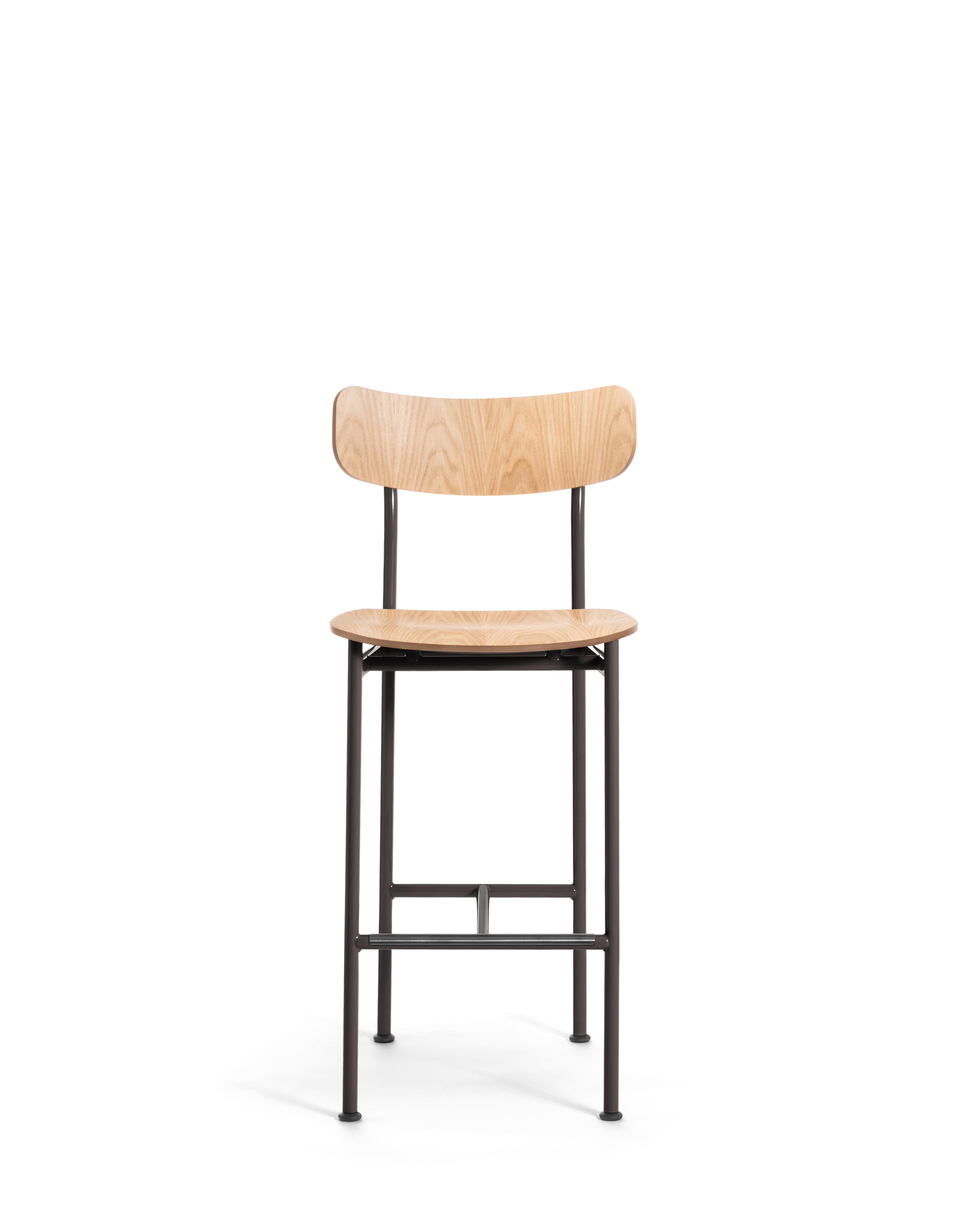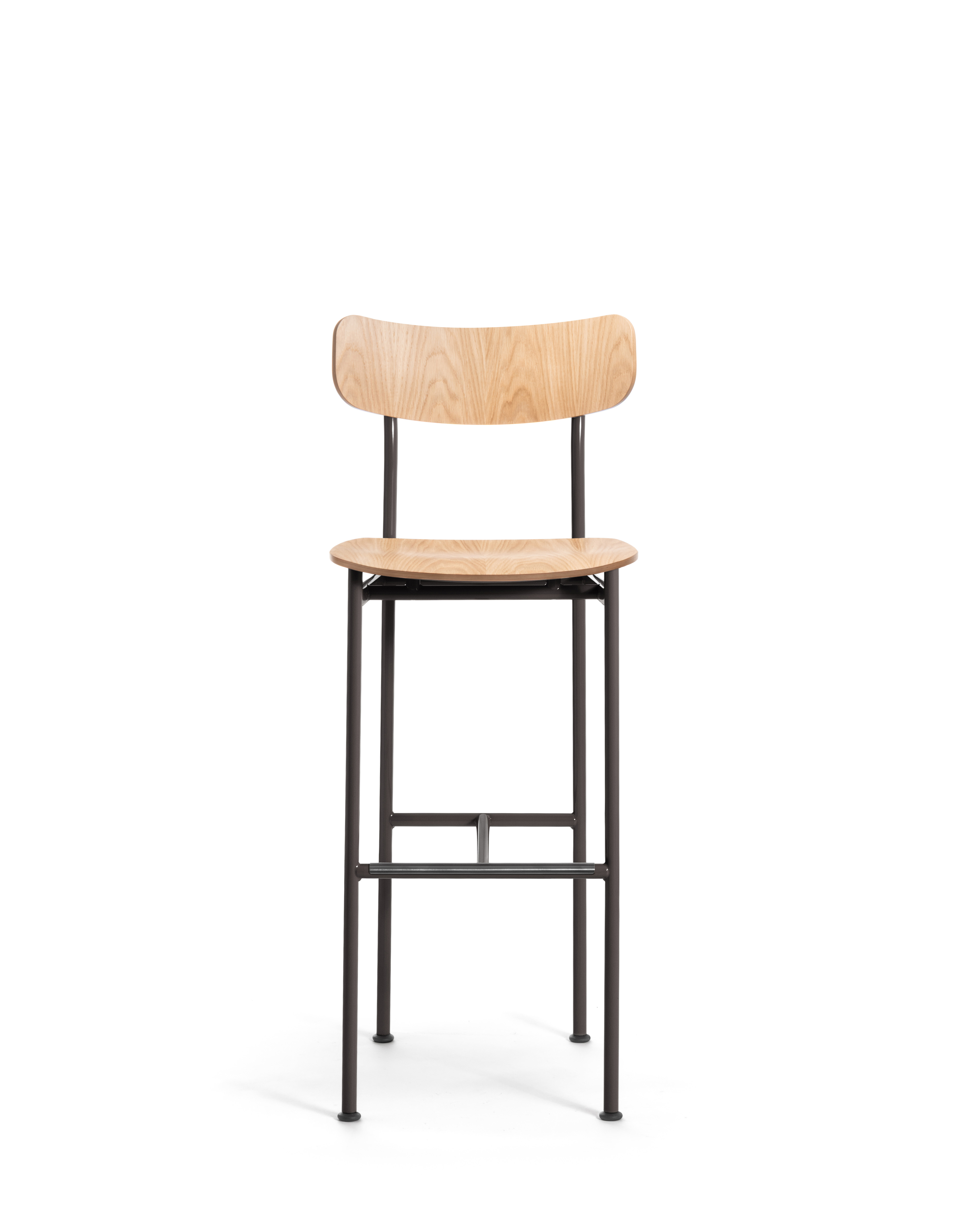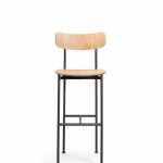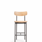 Matériaux: structure en tube d’acier verni poli. Assise et dossier en chêne multiplis naturel.