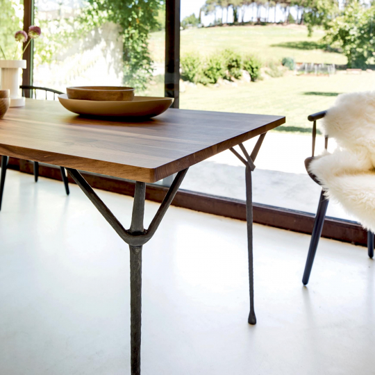 Matériaux: structure en fer forgé verni en polyester. Plateaux en noyer americain massif.