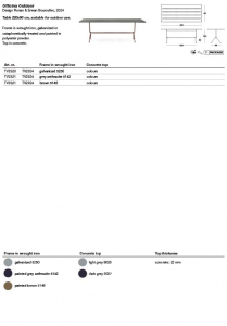 Matériaux: structure en fer forgé, galvanisé ou traité en cataphorèse et verni en polyester. Plateau en béton. Conçue pour l’extérieur.