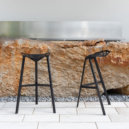 Matériaux: pieds en aluminium anodisé ou verni en polyester. Assise en aluminium injecté traité au titane fluoré et verni en polyester. Conçu pour l’extérieur. Coussin aussi disponible (Kvadrat Steelcut Trio, Kvadrat Steelcut 3, cuir).