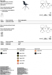Matériaux: structure en tube d’acier verni en polyester. Assise en polypropylène ou en hêtre multiplis, aussi avec façade recouverte de tissu ou de cuir ou en polypropylène, ou entièrement recouvert de tissu.