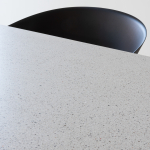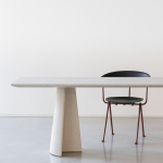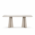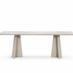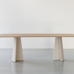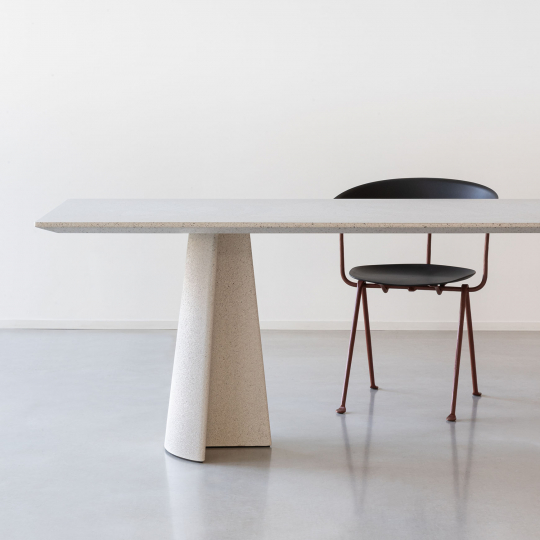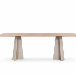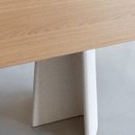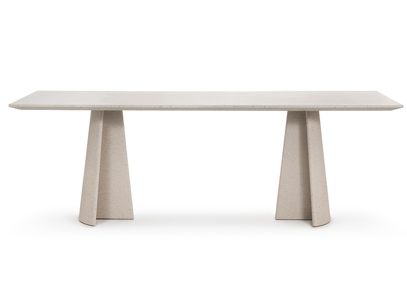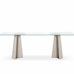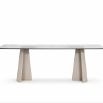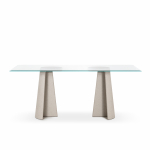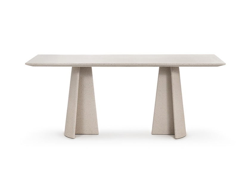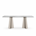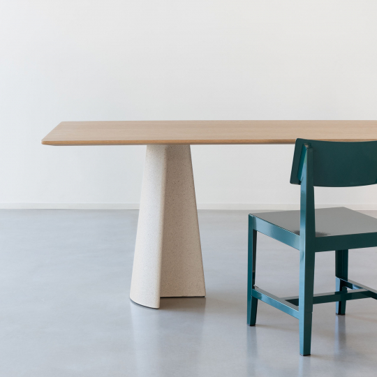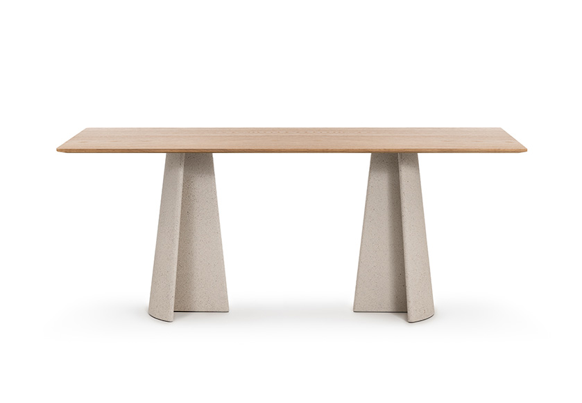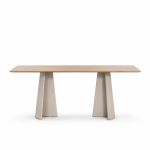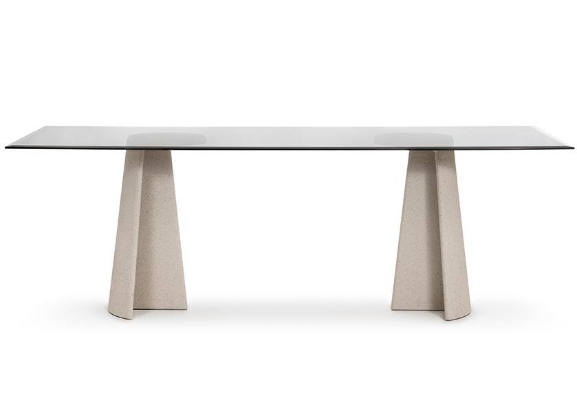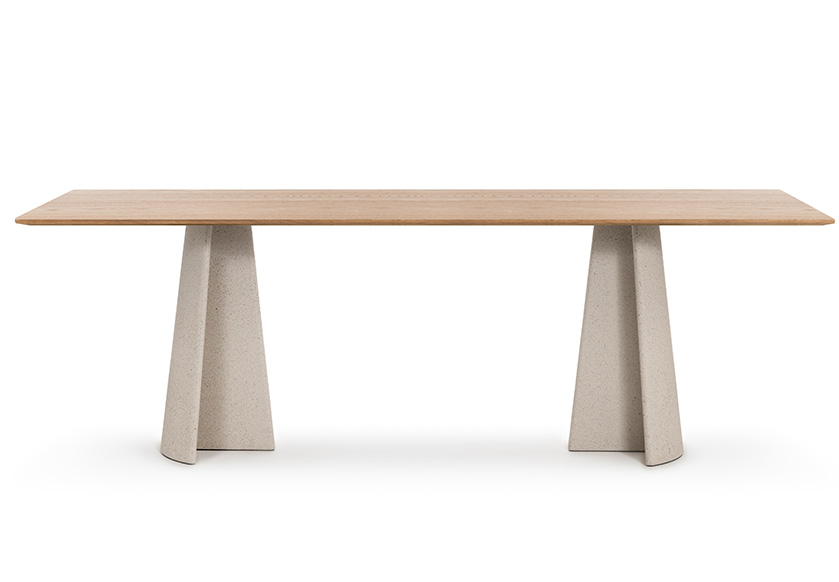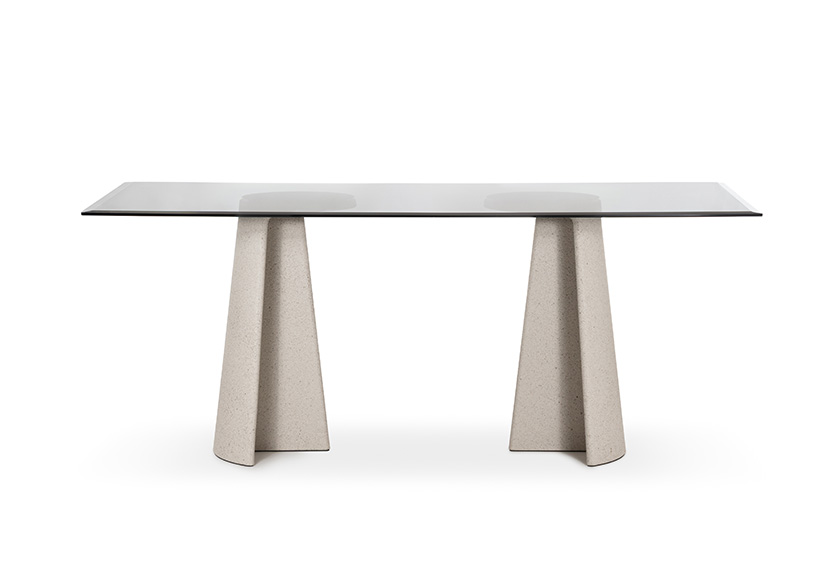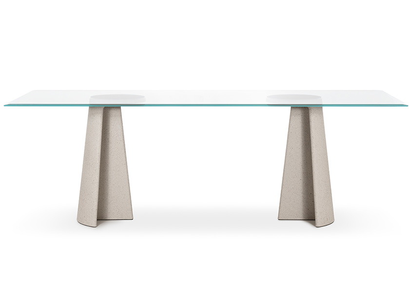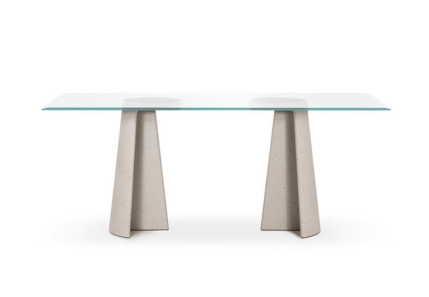 Materiali: base in cemento. Piano in cemento (adatto anche per esterni), in vetro temperato o in MDF impiallacciato rovere.