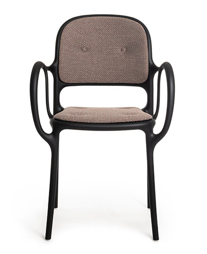 Materiali: polipropilene stampato in air-moulding. Finitura effetto seta. Cuscino sedile/schienale in poliuretano espanso, rivestito in tessuto.