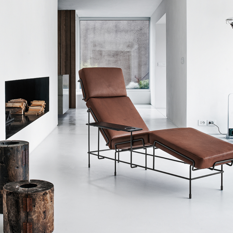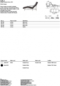 Materiali: struttura in tondino di acciaio verniciato poliestere; cuscini in poliuretano espanso rivestito in pelle o in tessuto sfoderabile (Velvet, Kvadrat Tonus, Kvadrat Colline, Kvadrat Tonica, Kvadrat Coda, Boxland leather). Tavoletta in pietra acrilica.