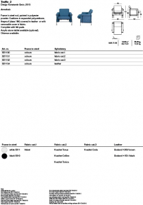 Materiali: struttura in tondino di acciaio verniciato poliestere; cuscini in poliuretano espanso rivestito in pelle o in tessuto sfoderabile (Velvet, Kvadrat Tonus, Kvadrat Colline, Kvadrat Tonica, Kvadrat Coda, Boxland leather). Disponibili tavoletta in pietra acrilica e ottomana.