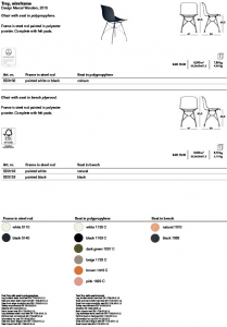 Materiali: struttura in tondino di acciaio verniciato poliestere. Sedile in multistrato di faggio o in polipropilene, anche con fronte anteriore rivestito in tessuto o in pelle o in polipropilene interamente rivestito in tessuto.