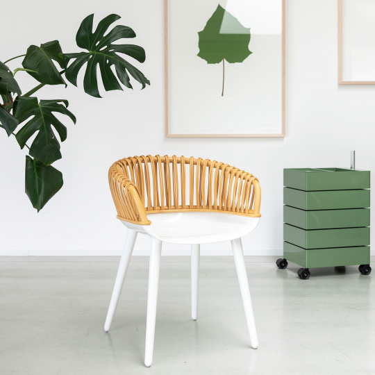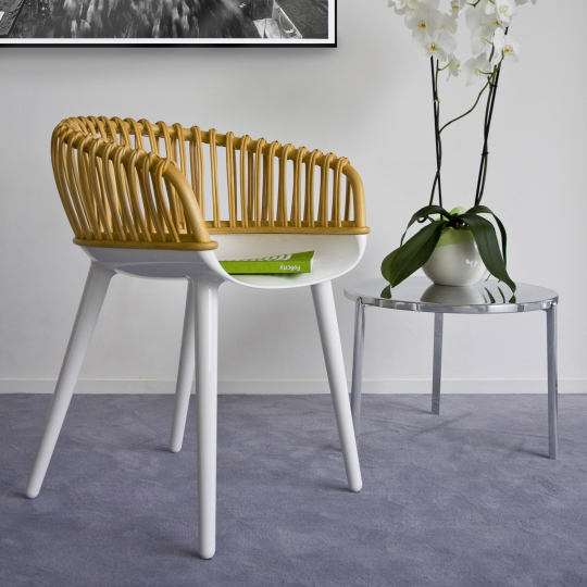 Materials: frame in polycarbonate, back in wicker. Also available cushion in expanded polyurethane covered in fabric (Kvadrat Divina MD, Kvadrat Divina Mélange, Kvadrat Remix).