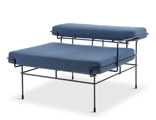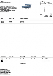 Materials: frame in steel rod, painted in polyester powder; cushions in expanded polyurethane with cover in leather or in removable fabric (Velvet, Kvadrat Tonus, Kvadrat Colline, Kvadrat Tonica, Kvadrat Coda, Boxland leather). Also available tablet in acrylic stone.