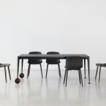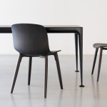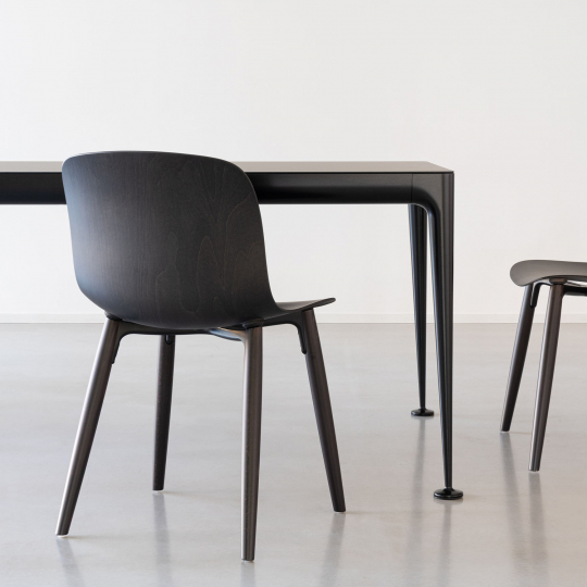 Materials: legs in solid beech, natural or stained, seat in polypropylene or beech plywood, also with front side covered in fabric or in leather or in polypropylene fully covered in fabric (Kvadrat Divina 3, Kvadrat Divina MD, Kvadrat Divina Mélange, Kvadrat Steelcut, Kvadrat Steelcut Trio, Kvadrat Hero, Kvadrat Vidar, Black Boxland leather (front covered version only). Joining element in die-cast aluminium, sanded or painted in epoxy resin.